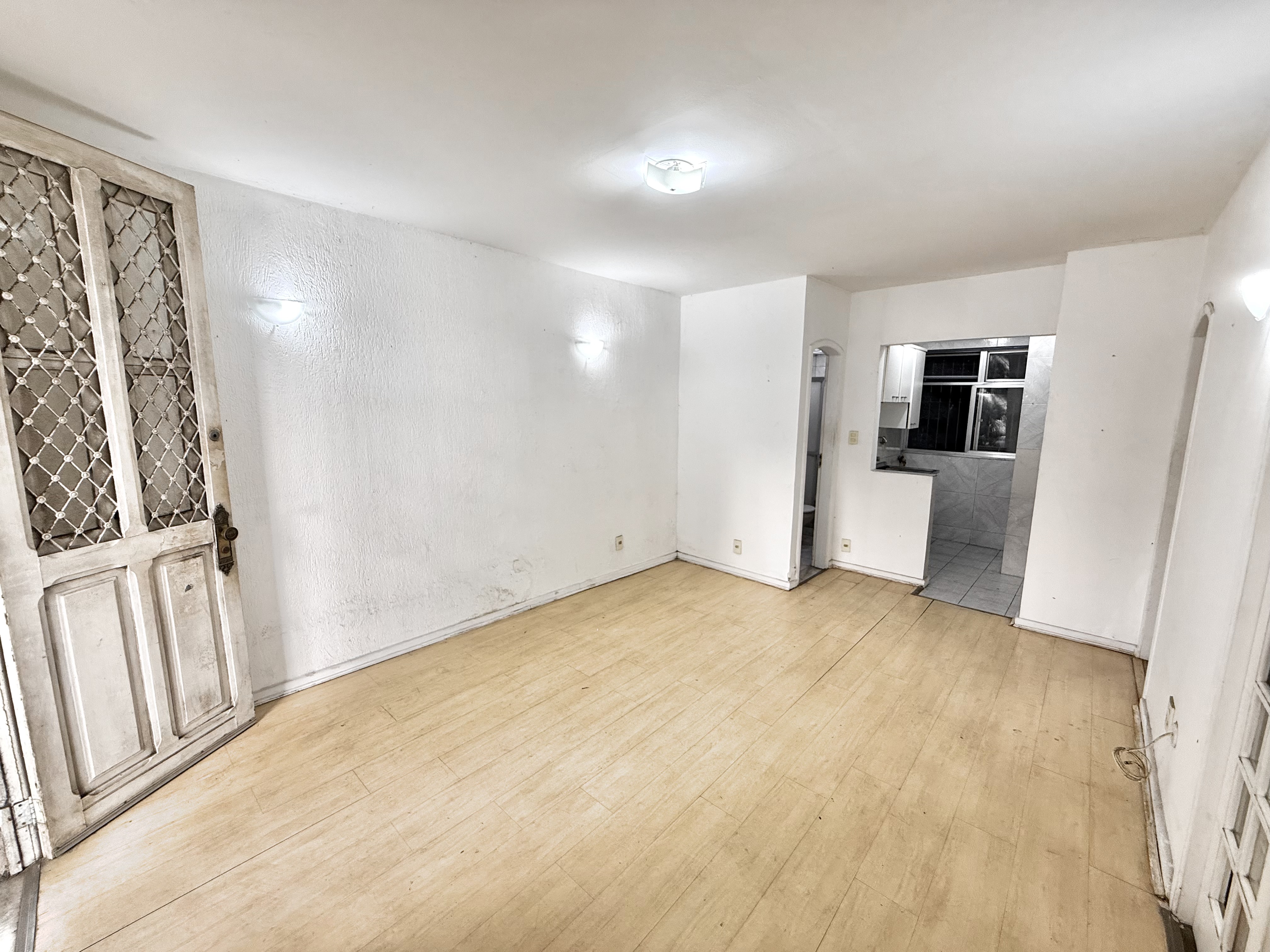 Distribución: sala de estar con cocina integrada, dos habitaciones (una con aire acondicionado), baño social y pequeña área de servicio.